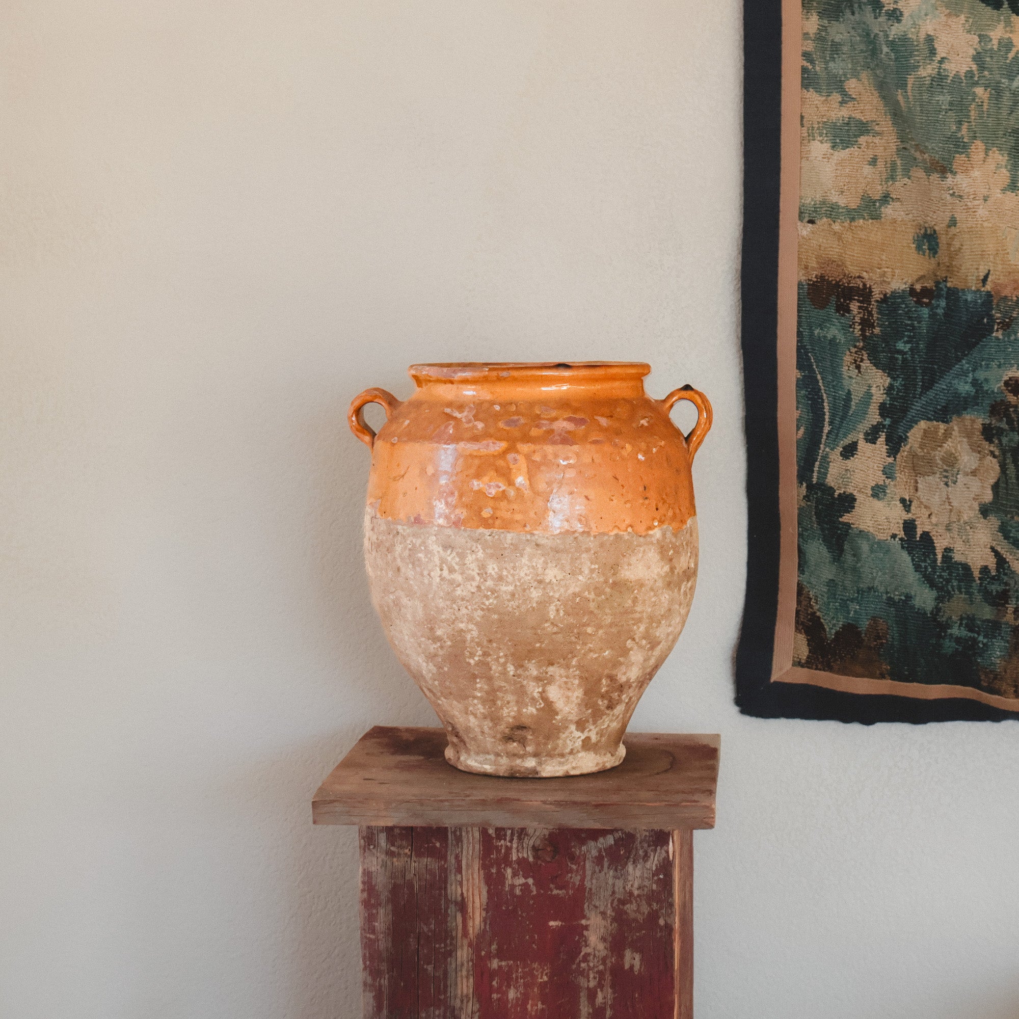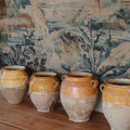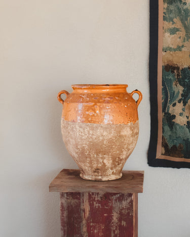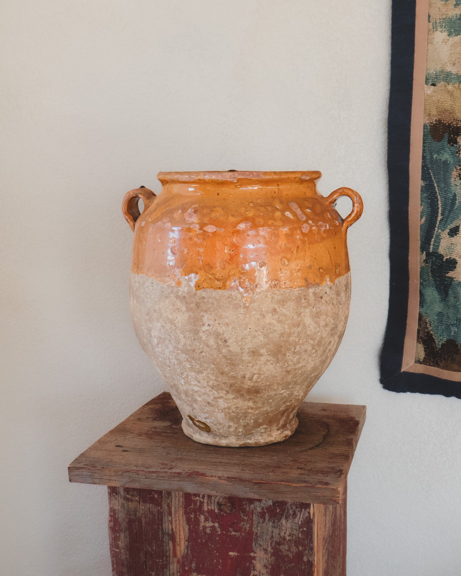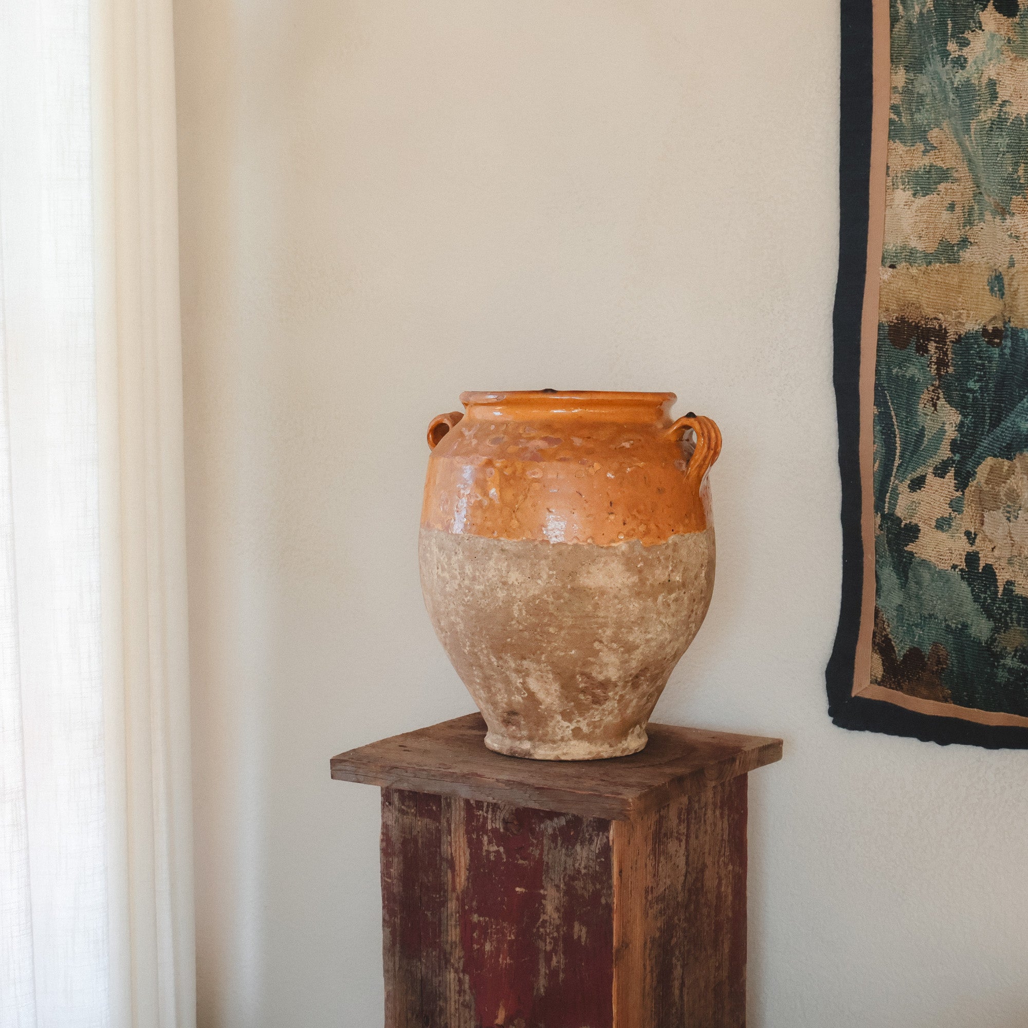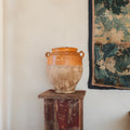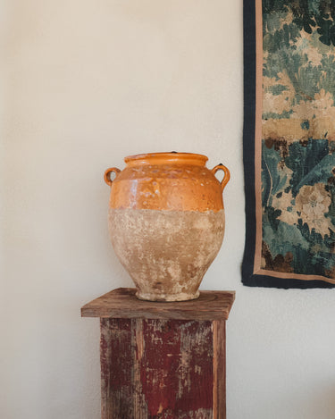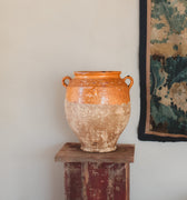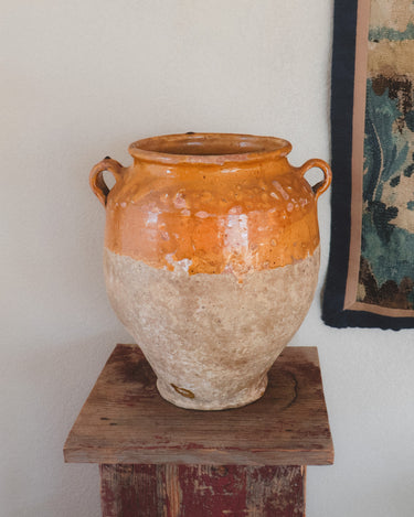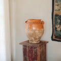 This late-19th-century Spanish storage jar once lived in a pantry room, holding olives, preserved meats, or beans for winter. The glazed interior protected the food while the porous clay kept it cool. The mineral bloom throughout the base remains from years spent against stone floors and cellar walls.